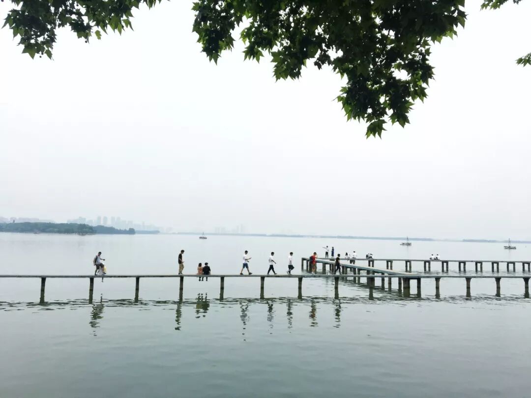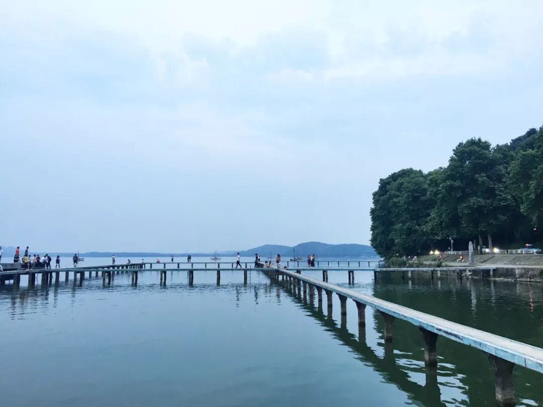 特别喜欢武大的凌波门,门外是东湖,宽广的湖面上有些交错的栈道,虽然窄窄的栈道走得战战兢兢,但是拍照很好看,也算是一个网红打卡处。