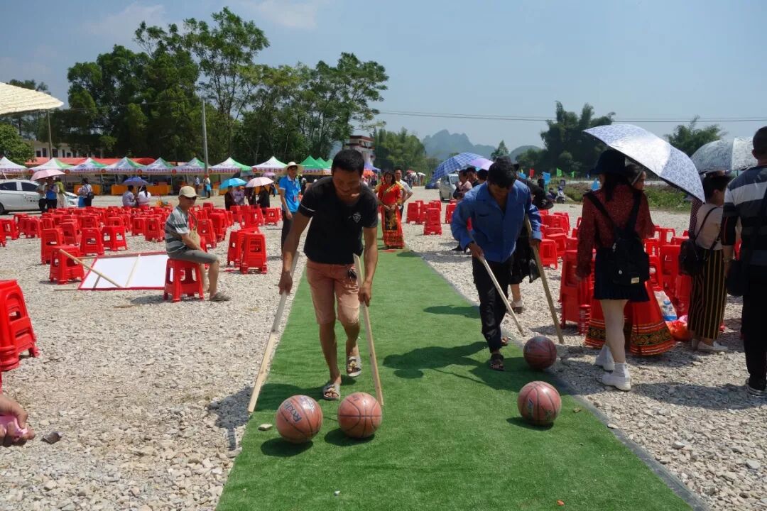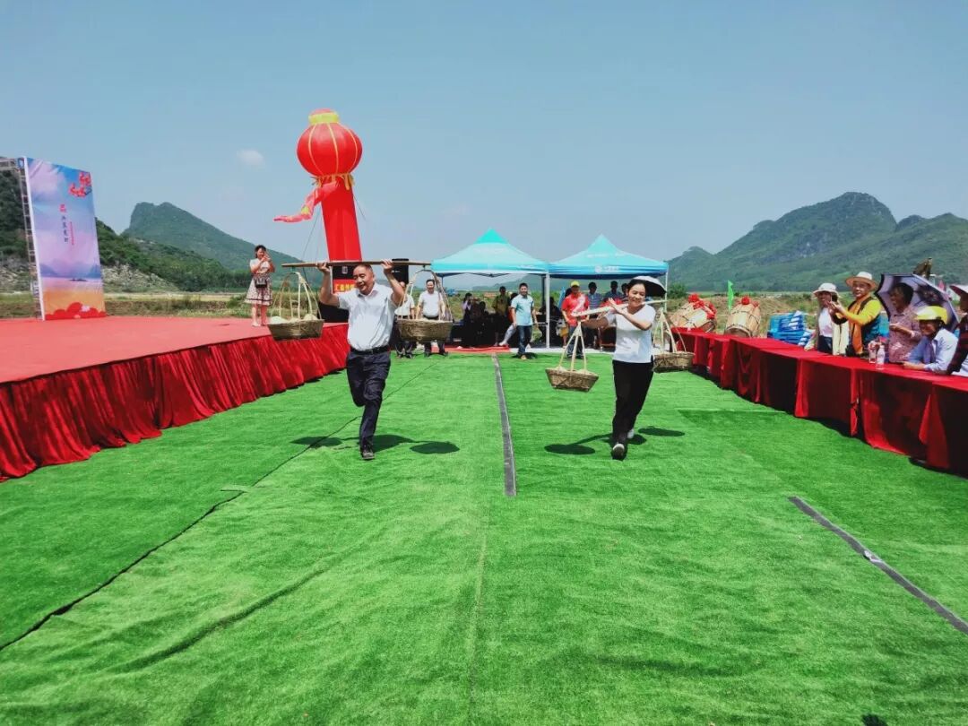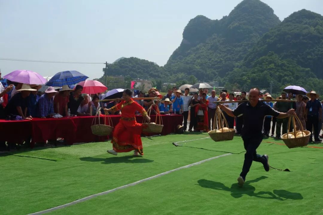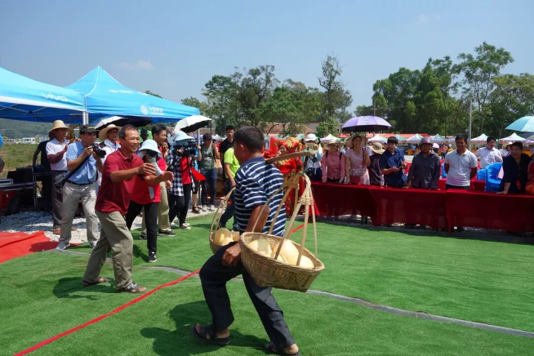 其中最为热闹的就数挑担接力赛了,兴宾区的24个乡镇分都派代表队参赛,4人为1组两队同时比赛,在20米内,挑着满满一筐柚子进行往返跑,先到达的队伍获胜。在你追我赶中,整个活动现场的气氛更加火爆!