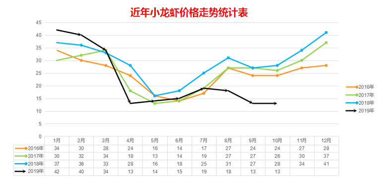 整体来说,2019年小龙虾价格呈现高开低走态势。早春时期温度较低,1至4月份小龙虾出塘数量较少,市场呈现供不应求状态,价格居高不下,直到5月份后稻虾和精养塘口小龙虾开始大量上市,市场呈现供大于求状态,价格一落千丈。7、8月份受高温影响,小龙虾产量下降,市场供求开始出现微妙调整,价格有所回升。但是从往年持续回升的情况来看,今年9、10月份小龙虾价格依旧疲软,低价位运行!所以可以预期来年小龙虾价格走势的“凹型”趋势会更加明显,5月份后小龙虾价格将会更低更惨,所以2020年的一个盈利点唯有“出早虾”。