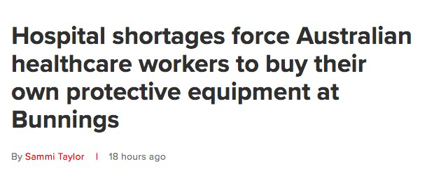 毕竟医疗物资在澳大利亚也是稀缺品,即将要用尽。一线医生被迫自己前往bunning购买护目镜,口罩和防护服。