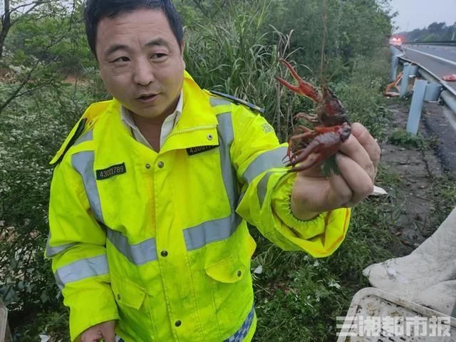 接到报警后,庙前路政大队二分队当班分队长唐鸿、队员邓笛立即赶赴事故现场。到达现场后,他们发现车辆侧翻在行车道上,车辆损坏并不严重,但是车上装载小龙虾的笼箱全部倾倒在地,有部分还掉进了路边的护坡上,千余斤小龙虾在高速上、护坡上上演“大逃亡”。驾驶员刘师傅和同伴正蹲在地上,把散落在草丛里和树林里的小龙虾一只只地往笼箱里装,希望能够尽可能多“抓回”一些小龙虾,挽回一些经济损失。