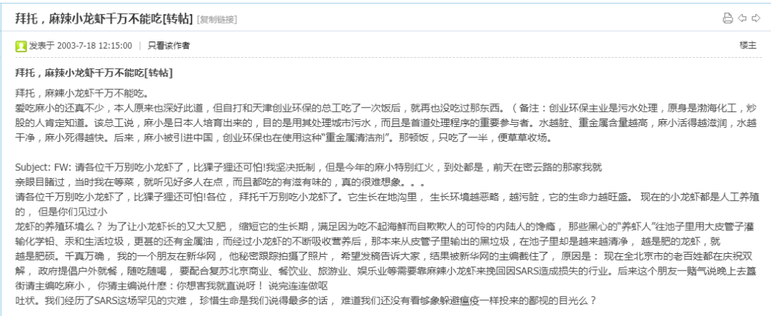 早在2003年,网络上就有帖子声称小龙虾养殖环境恶劣无比,“往池子里用大皮管子灌输化学铅、汞和生活垃圾,更甚的还有金属油……”