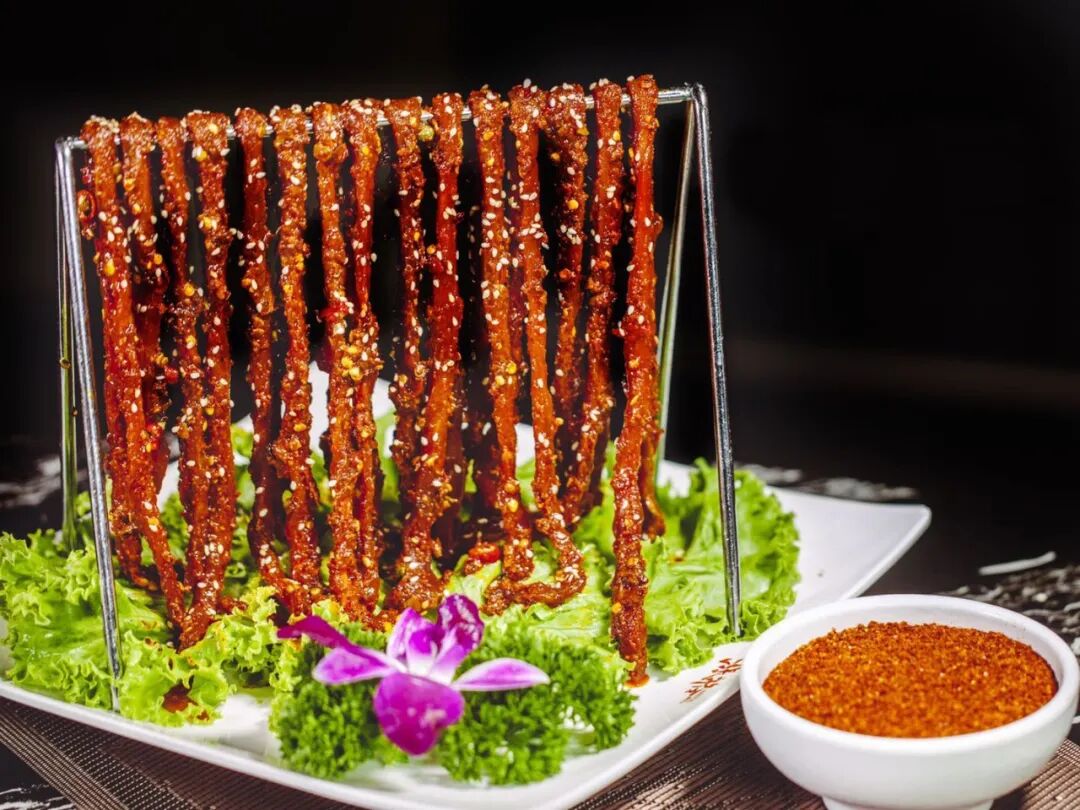 一根根小手指粗细的牛肉,被整齐地 挂在架子上,鲜嫩的牛肉条裹着一层辣椒,还有些许芝麻,光看这品相,是不是就已经垂涎三尺了?更重要的是,嚼劲十足。