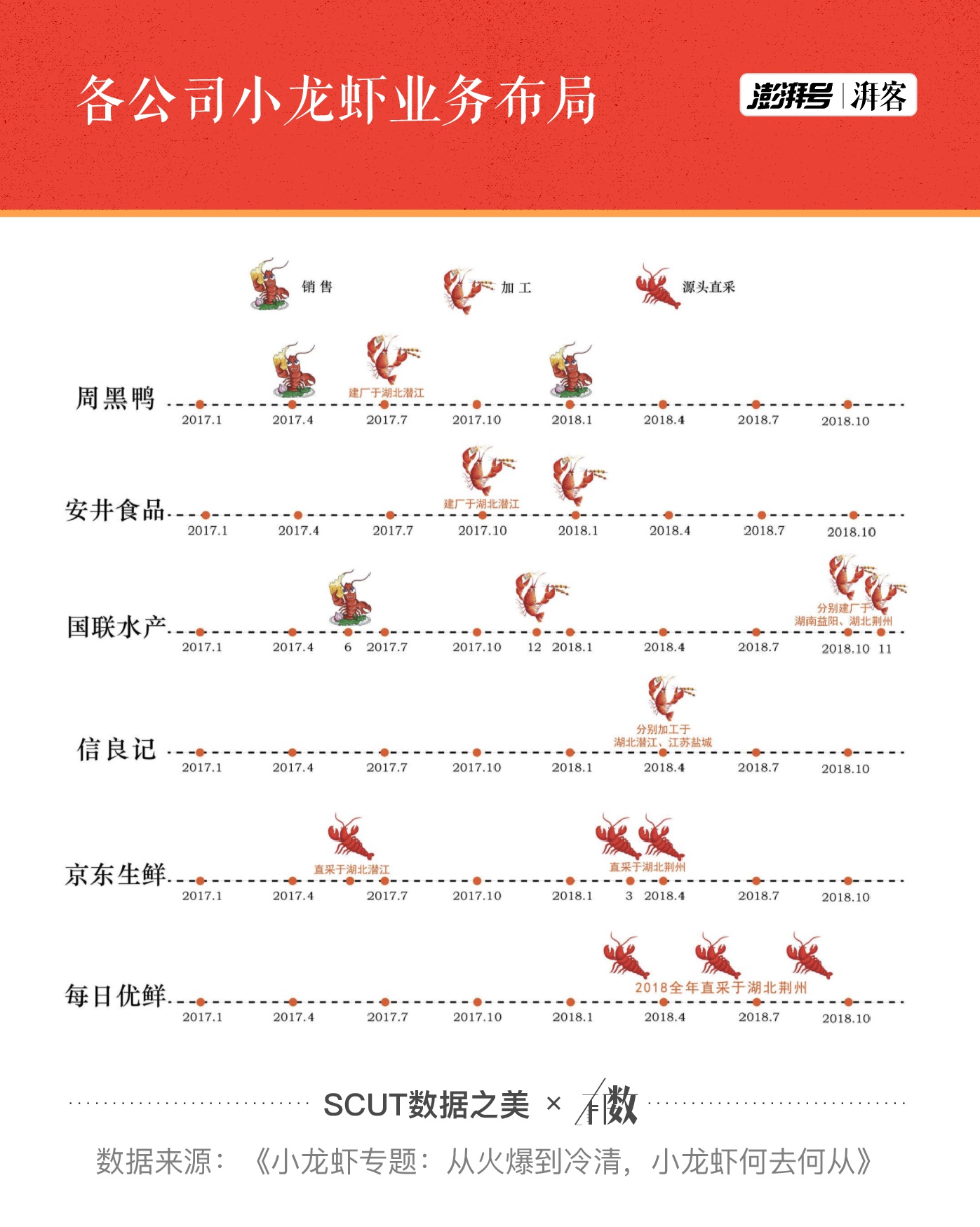 市场的火爆离不开品牌的助推。周黑鸭、安井食品、国联水产、京东生鲜早在17年就展开了小龙虾产业的投资与布局,每日优鲜也在18年建立了小龙虾产业的直供体系,在湖北荆州洪湖市建立直采基地。冷链配送与物流体系的快速发展,保证了小龙虾能出现在全国人民的饭桌上。