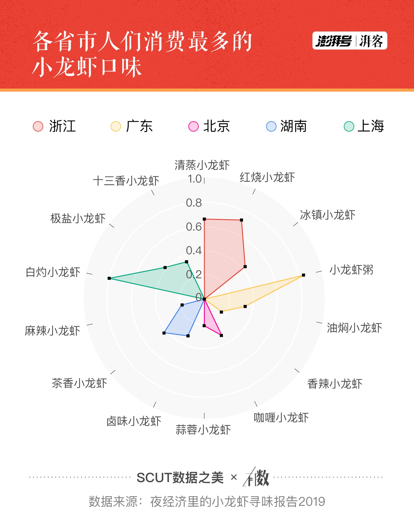 地利。中国传统的烹饪方式——煎、炒、炸、煮都非常适合用来料理小龙虾。十三香、蒜蓉、香辣、油焖、清蒸……口味众多,又因地制宜。广东人对小龙虾粥情有独钟,红烧小龙虾和干焗小龙虾最受浙江和江苏食客的欢迎。