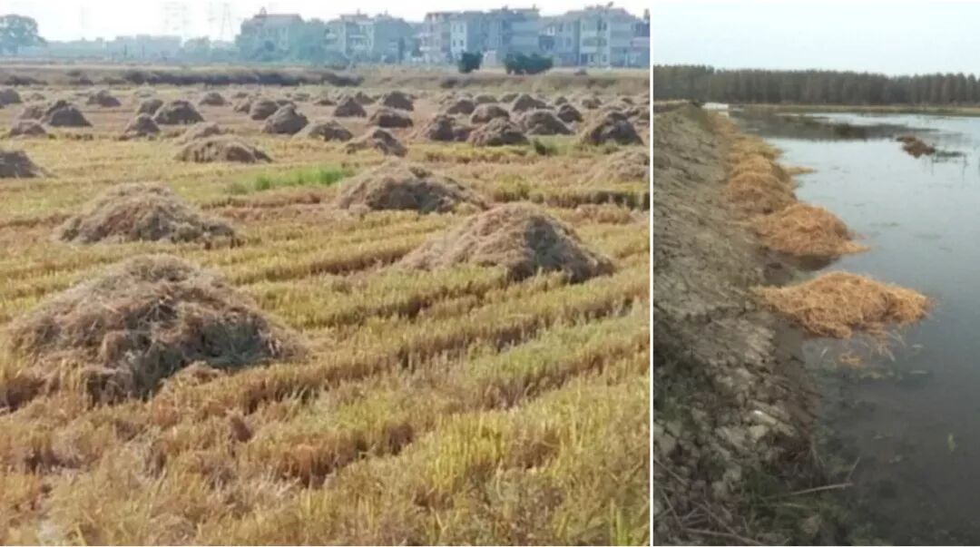 收割后的稻草梗最好打包带走1/3-1/2,余下稻草经大太阳暴晒3-5天后,在稻田面使用农具将其打堆(堆距横向和纵向都为8-10米);环沟内侧最好利用稻草打堆(堆距8-10米)便于虾苗越冬,每堆稻草可高达70-80cm;最好开年后3月底4月初温度上来将其用农具扒开,防止稻草腐烂对龙虾造成毒害。