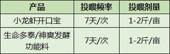 打到苗后,第一次投喂神爽小龙虾开口宝,3-4天后接着投喂【生命多泰/神爽发酵功能料】,即交替投喂,确保虾苗快速生长和提高虾苗成活率;投喂剂量根据虾苗多少来调整,按环沟面积计算:一般1-2斤/亩;投喂时间和方法:晴天中午12:00-14:00,将以上产品化水泼洒。