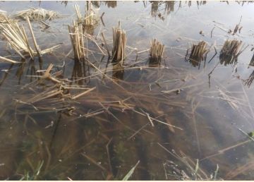 有的田面土壤为了收割稻谷经长时间暴晒后偏硬,再者稻茬多,不便于处理后续红黑水问题,可以考虑田面上5-6cm水,进行隔行旋耕(每隔8-10米旋耕5-6米),一是红黑水问题降低,经旋耕后的稻茬浅埋土壤,还持续不断为水体提供肥料;二是便于栽种水草。