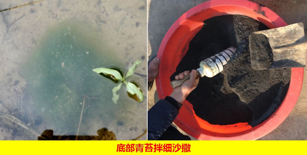 青苔防控:水绵青苔刚萌发时,是处理青苔的最佳时间,可以选用【黑土金】+【益藻源】(1:1,4-6亩/组)混合均匀后使用,水面青苔直接干撒,底部青苔拌细沙撒,严重区域重点撒。