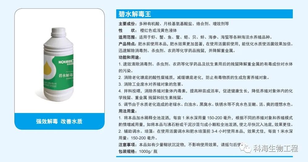 (1)解毒(碧水解毒王):解除稻田杀虫剂、除草剂等农药的残留;解除杀青苔后青苔死亡产生的毒素。