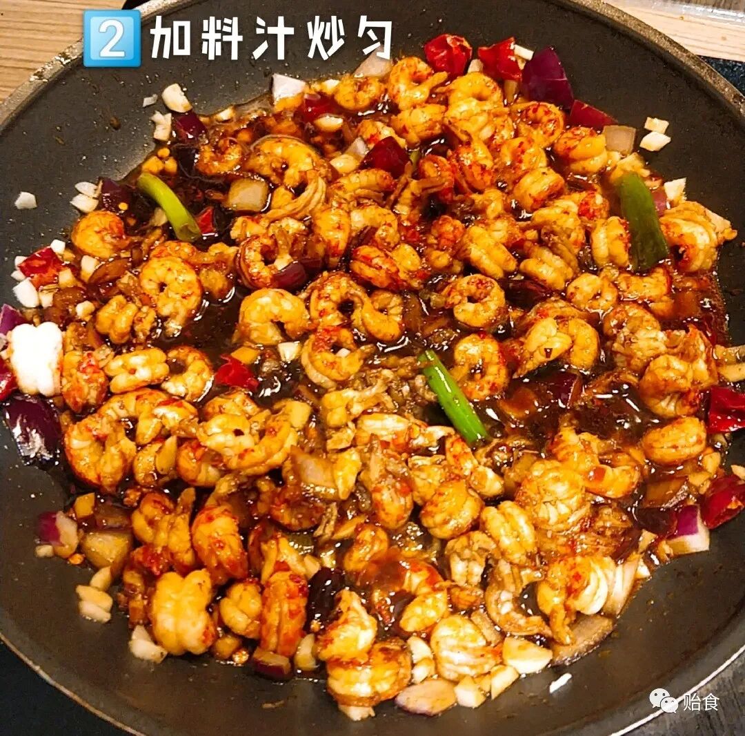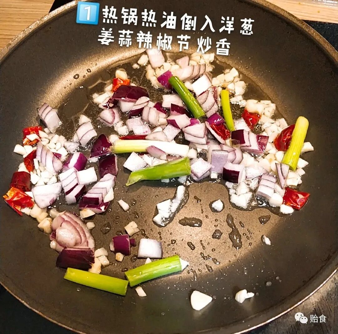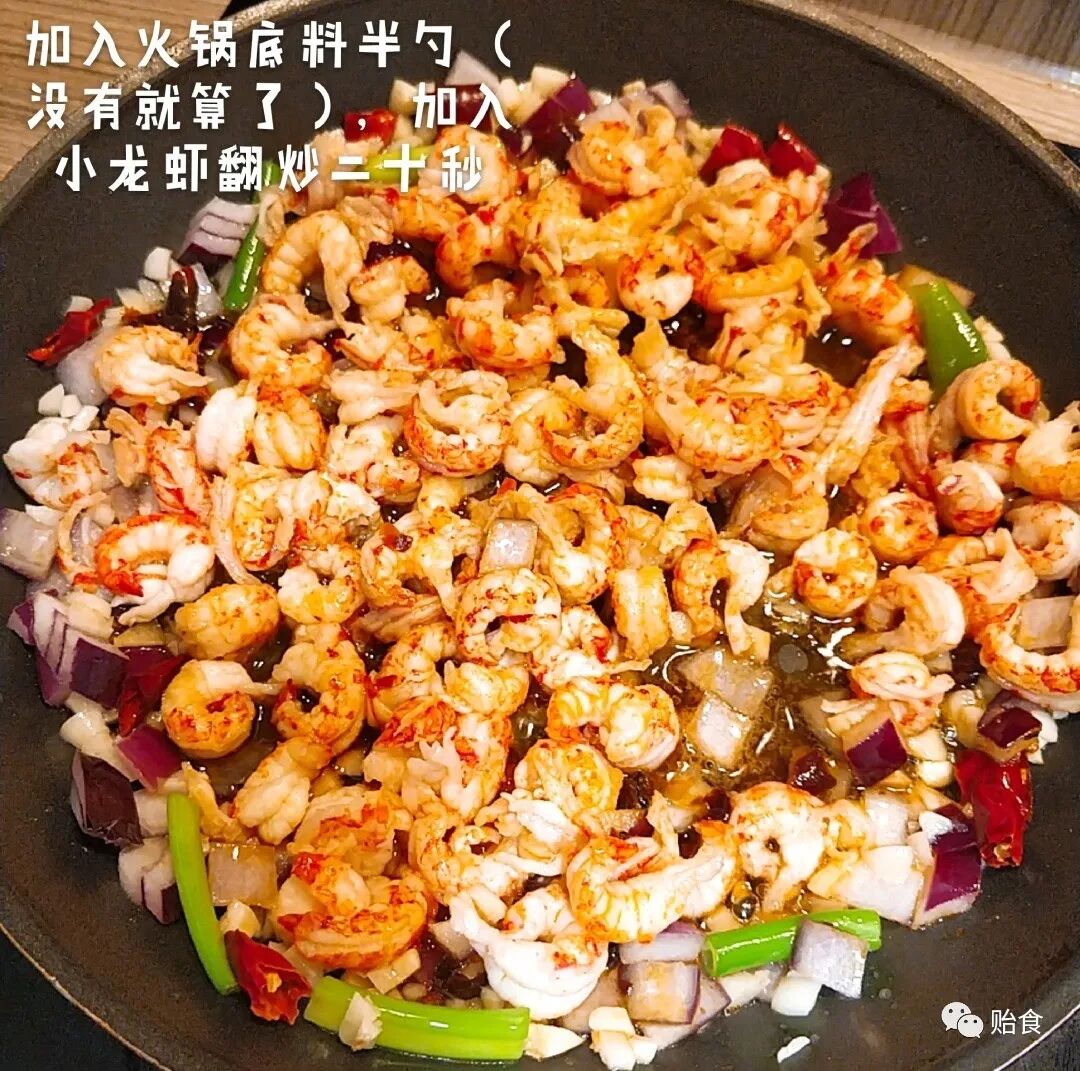 ️1.热锅热油倒入洋葱姜蒜辣椒节炒香,加入火锅底料半勺(没有就算了),加入小龙虾翻炒二十秒