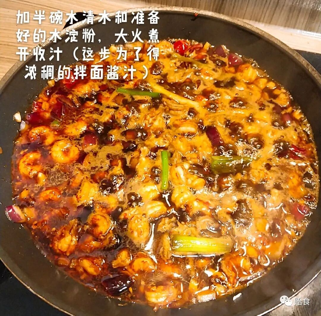 2.加料汁炒匀,加半碗水清水和水淀粉,大火煮开收汁(为了得浓稠的拌面酱汁) 出锅盖面香喷喷!