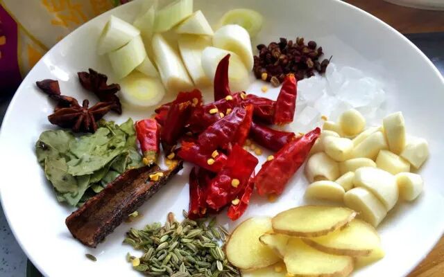 3、准备辅料:干辣椒50克、花椒5克、鸡精20克、食盐7克、白糖3克、葱段、蒜瓣、干花椒面、熟芝麻、香菜段、洋葱块、青红椒块、姜片适量。